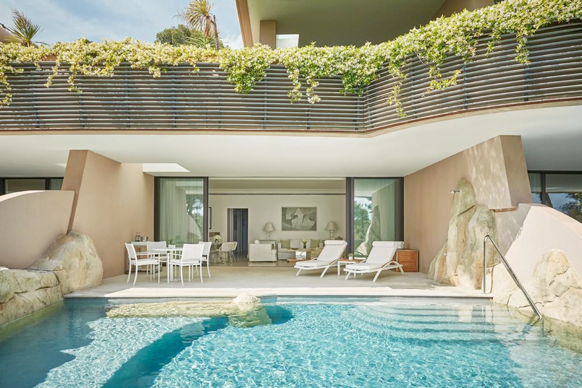 Rooms and suites are stylish yet understated, with neutral tones and soft fabrics creating a relaxing atmosphere. Many rooms have floor-to-ceiling windows that open to private terraces or balconies, offering breathtaking views of the sea or gardens.