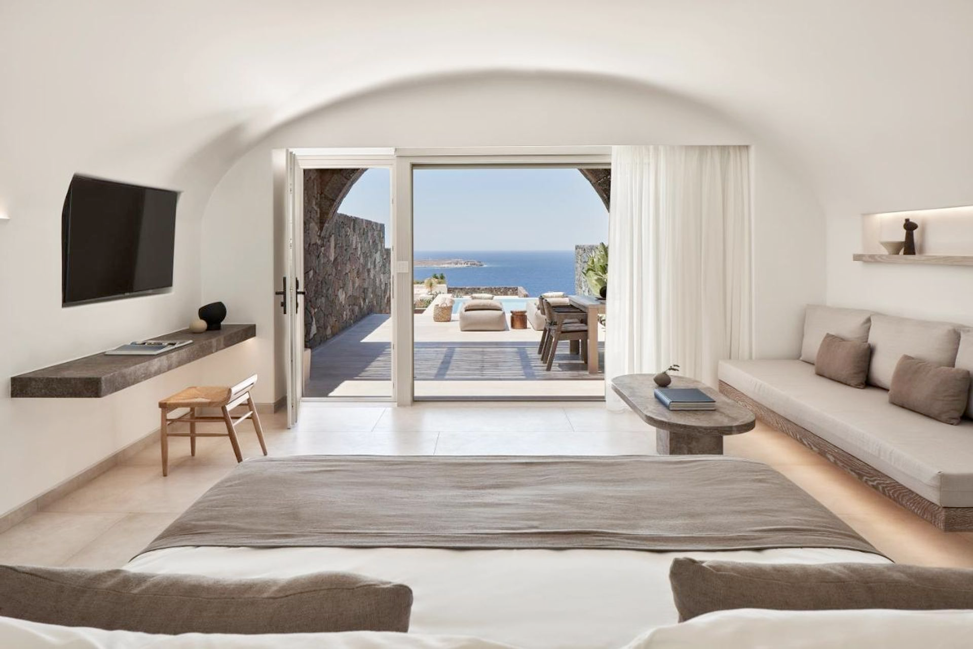Canaves Ena offers an intimate and exclusive stay in Santorini. With just a handful of suites, the hotel guarantees privacy and personalized service. Each suite is designed with simplicity and sophistication, featuring spacious interiors and private terraces.